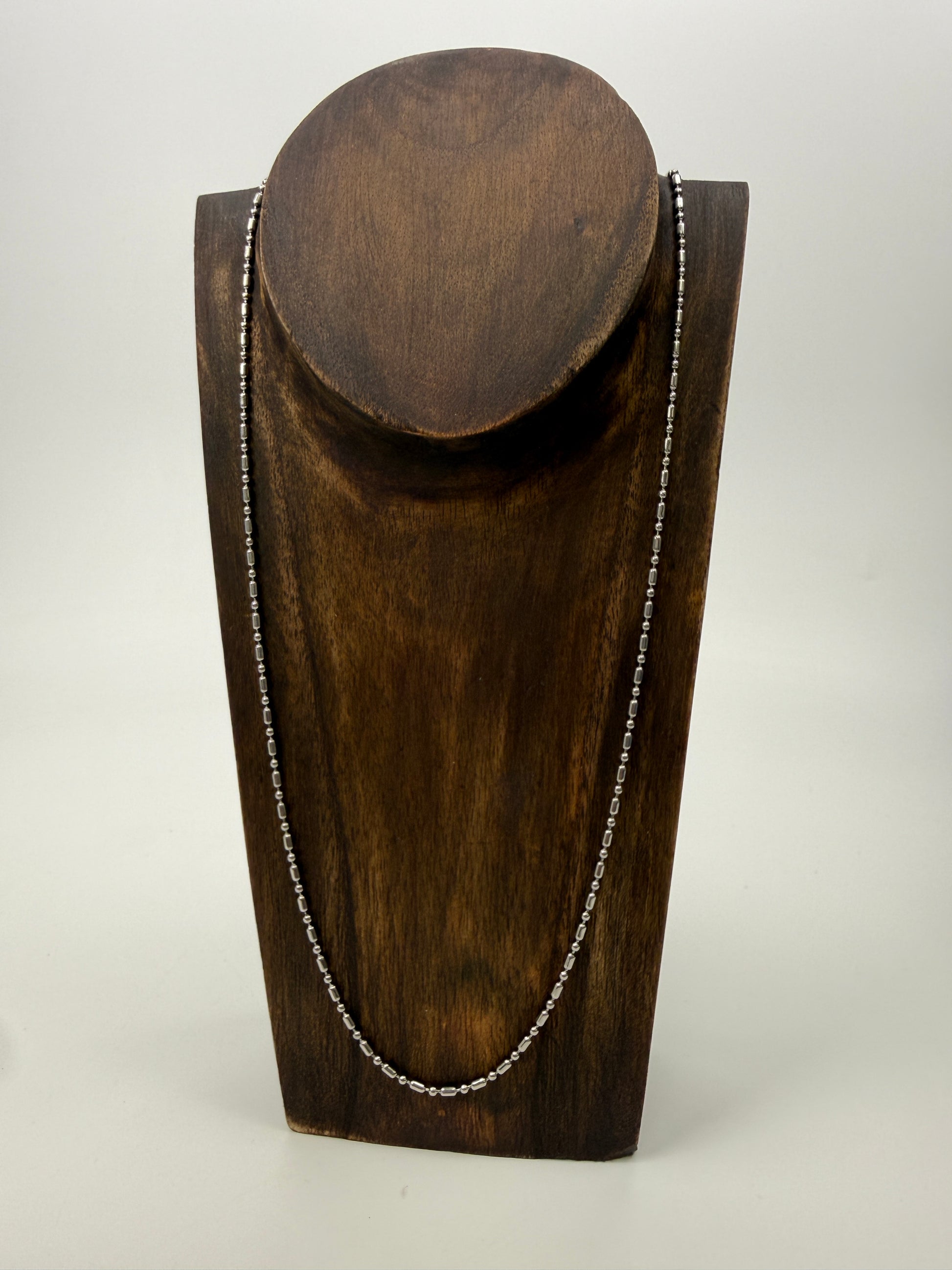 A fun twist on the classic ball chain — alternating small round beads and elongated bars create a "dot and dash" pattern that catches the light. At 22", this sits at a longer, layering-friendly length. Stainless steel keeps it worry-free for everyday wear.