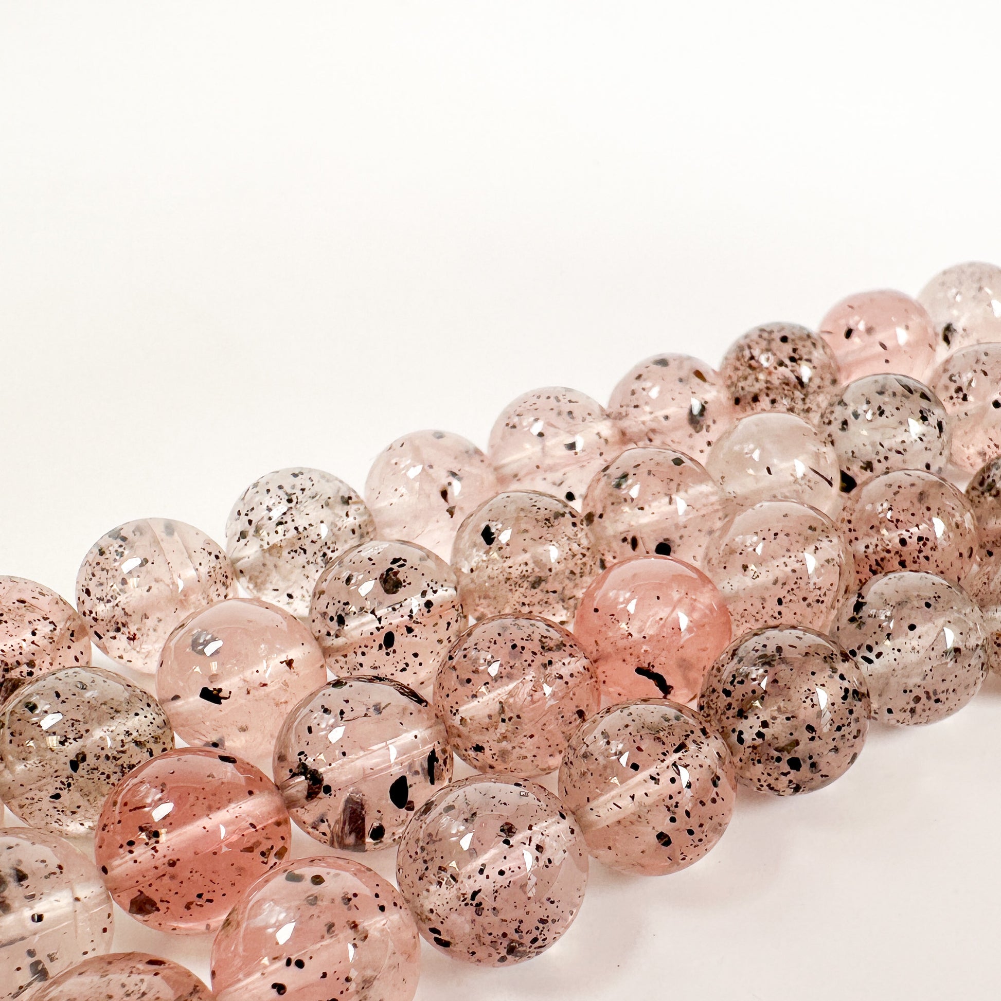 These are so pretty—tiny hematite inclusions speckle through the soft pink quartz like delicate drops of spattered ink. The blush color is so gentle, and the combination gives you the grounding energy of hematite with the loving, heart-opening quality of rose quartz, all in one bead. A great focal for earrings or as a standout pair in a bracelet design.