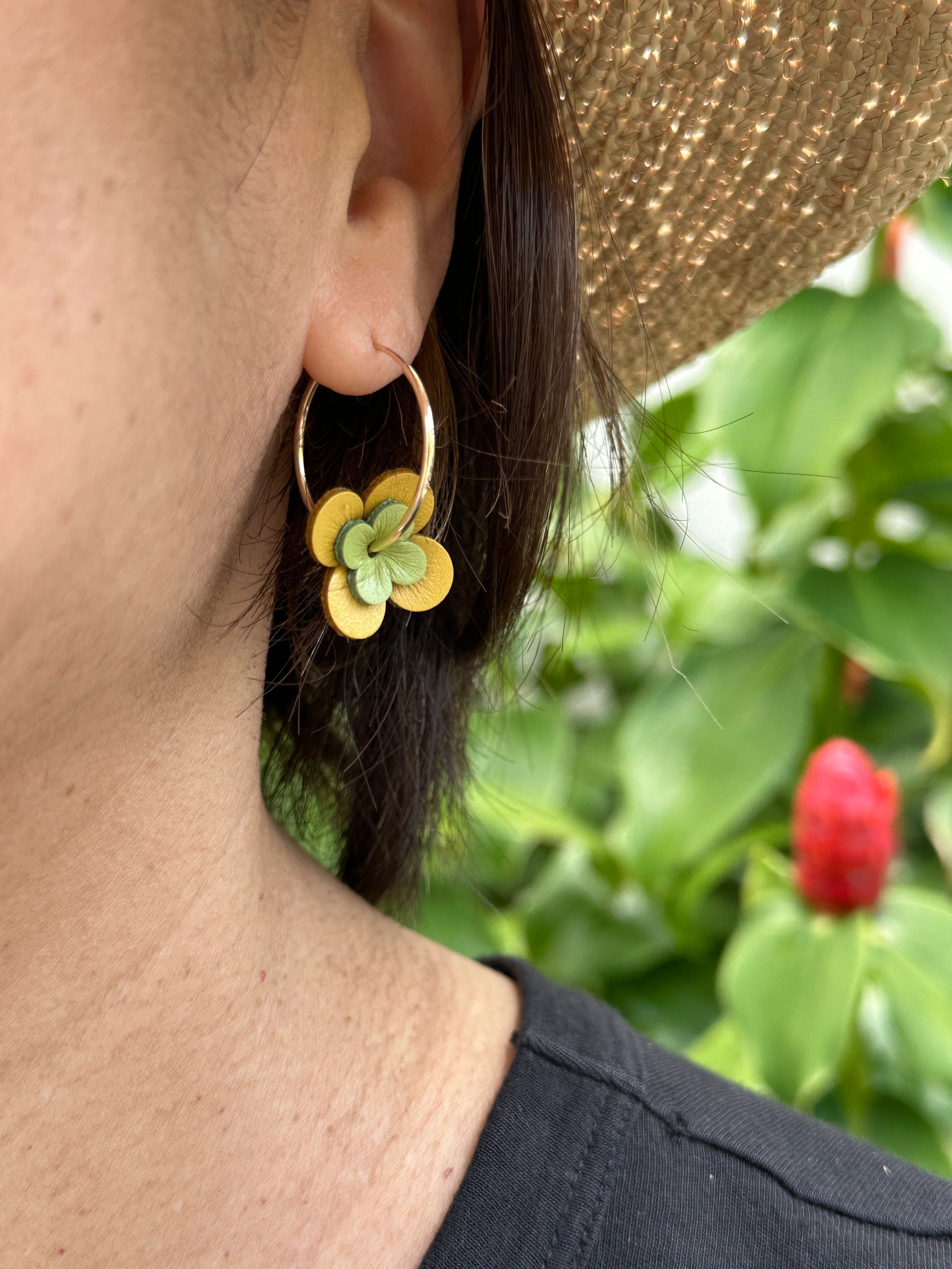 These pretty, handmade leather flower earrings are FOREVER FLOWERS that capture the essence of Aloha with the vibrant colors of Hawaii’s favorite blossoms! We adore the pure white of jasmine and pikake, the sunny yellows and fiery oranges of hibiscus and puakenikeni, the soft pinks of plumeria, and the fresh greens of pakalana!