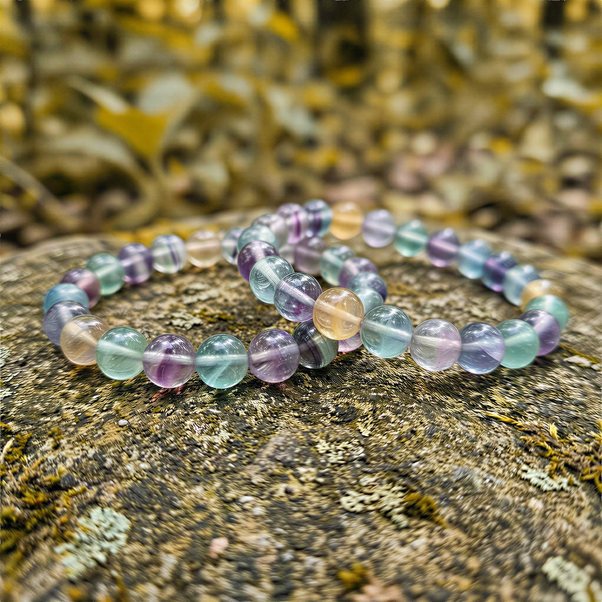 Fluorite is sometimes called the "genius stone" - students and writers have kept it on their desks for centuries, believing it clears mental fog and helps with focus. These rainbow fluorite beads show bands of purple, green, and clear running through each stone, like layers of thought. A good one to wear when you need to concentrate or just want something calming on your wrist.